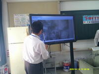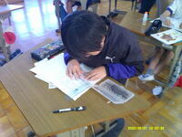 そして、ICT活用!!大型モニターでは、書道の達人である自分の大先輩(昔、大変お世話になりました)鈴木修三先生が、実際に同じ課題を描き上げている動画を提示していました。この課題でのポイントも示してくれているので、しっかり動画を見て、自分の文字との違いを確認しながら練習した児童は、短時間のうちにかなり上達しました。