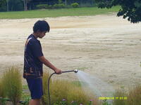 校庭には、児童昇降口前とプール脇校舎側に2本のイヌマキ(だと思います)の木があります。夏の終わりから初秋にかけて、このマキの新芽が伸びて、突き出したようになります。放っておいても害はないのですが、かっこ悪く感じて個人的には気になってしまうので、高所用の脚立を持ち出して剪定してみました。きちんと刈り込んで形を整えることはしていないので、剪定ではなく「剪定の真似事」です。