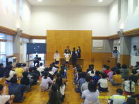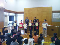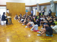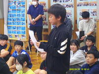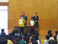 今日は、前期の最終日です。けやきルームで、終業式を実施しました。夏休みの読書感想文コンクールと科学作品展の入賞者の表彰、各学年代表の「前期にがんばったこと」の発表、校長の話、最後に全校で校歌を歌いました。