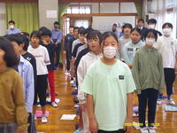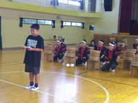 後期終業式の後、体育館へ移動して「太鼓部を励ます会」を行いました。太鼓部は10月26日(日)に野田芽吹学園のお祭りでの演奏披露、そして28日(水)に野田ガスホールで開催される「市内小中音楽発表会」に学校を代表して出場します。今日は、その時に演奏する「福にっこり太鼓」と「三ケ尾獅子太鼓」の2曲を聴かせてくれました。