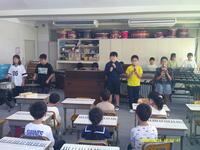終盤では、CDの伴奏(+歌)に合わせて、全員で演奏しました。大舘先生のていねいなご指導もあり、みるみる上達していくことがわかります。CD伴奏からずれることもなく、最後まで演奏しきることができました。2年生、とっても上手です!