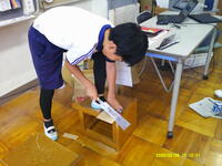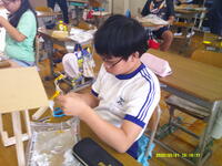 6年生は、図工で木工に金属素材を組み合わせて制作する「金属と木でチャレンジ」の学習に取り組んでいます。教材のセット+自身で準備した装飾用品や自然の素材(木の皮やドングリ、松ぼっくり等)を組み合わせて、自分の思い描いた作品に近づけるよう作業をしていました。のこぎりを引く音や、金づちのリズミカルな音が教室に心地よく響いていました。