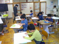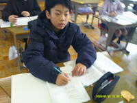 県特別非常勤講師の石塚先生を講師にお迎えして、1~4校時にかけて3~6年生の書初め練習を行います。1・2校時は3・4年生の練習です。ご自身が書かれたお手本をもとに、「上手に書くこつ」を丁寧に説明して下さった後、練習に入りました。
