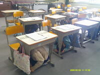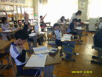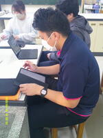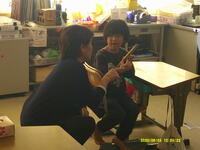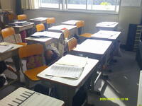 1年生は音楽で、カスタネットを使ったリズム打ちに挑戦していました。「Bling Bang-Bang-Born」と「千本桜」の二曲に取り組みました。テレビモニターに流れて写される符号に合わせて、カスタネットと机上に印刷された鍵盤をたたきます。(テレビモニター画面のイメージは思い切り「太鼓の達人」です)かなりテンポが速く、自分には全くついていけません。もちろん1年生も…ですが、ちゃんと最後の決めだけは、ぴったり合いました。