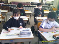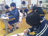 5年生は、書写で「明るい選挙書初め展」の課題練習(出品は自由)をしていました。5年生の課題は「清き投票」です。県書初め展(書星会書初め展・校内席書会)の指導は、特別非常勤講師の石塚先生が指導してくださいますが、今回は通常通り菅教頭先生の指導です。