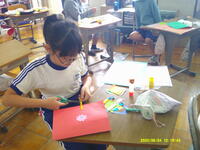 2年生は図工で、カラー工作用紙を素材にし「まどのあるたてものを作ろう」の学習に取り組んでいます。今回の重要なポイントは、「まどのある」ということで、はさみで切ることができないので、カッターを使って作業を進めることにあります。担任の國分先生から、使い方についてとても丁寧に「けがをしないための使い方」がありました。若干、おぼつかない様子の子もいますが、國分先生や教務の家髙先生(助っ人先生)の支援を受け、上手にカッターを使って「まど」を切り取ることができていました。