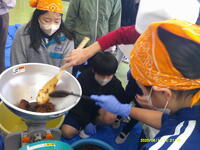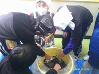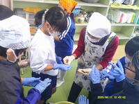 「天地返し」とは、仕込んだみそを空気に触れさせて微生物の働きを活性化させ、発効促進と風味アップを図る作業の総称です。今日は表面にできたカビの部分をスプーンで除去した後に「チョッパー」と呼ばれる機械に仕込んだみそを入れ、攪拌しながらすりつぶして空気に触れさせました。攪拌したことにより、体積も少し増えます。「うわぁ、ひき肉みたいだぁ!」出口から出る摺り潰されたみそを見て、子どもたちから自然に声が上がりました。少し味見をした後で、再び密閉し寝かせたら、「福二小特製みそ」の完成です。楽しみですね!また、近いうちに3年生が来年出来上がるみその仕込み作業を行います。講師の皆さん、ありがとうございました。