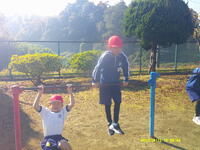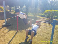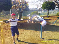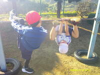 その後は、「てつぼうあそび」に取り組みました。「鉄棒運動」ではないので、腕で体を支えたり引き付けたりする感覚、身体を逆さにしたり回転したりする感覚を、楽しみながら身に詰められるとよいです。