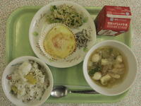 今日の献立は、韓国風の献立です。韓国語で、「クク」がスープ、「パブ」がごはんの意味です。韓国には、汁物にご飯を入れて混ぜて食べる習慣があり、クッパと呼びます。今日は、キムチが入ったスープにご飯を入れて食べるとおいしいメニューです。