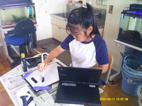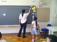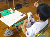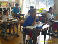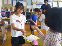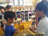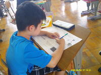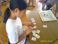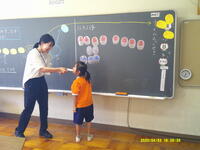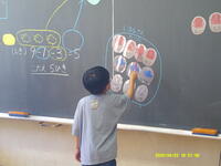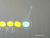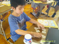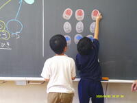 1年生は算数で「3つのかずのけいさん」の学習をしましt。「電線に鳥が9羽止まっています。1羽がとんでいってしまいました。その後、また3羽とんでいってしまいました。残った鳥の数は何羽ですか?」というようなもんだいで、今までは式を二つに分け、9-1=8(…1羽飛んで行き、残りは8羽)8-3=5(残った8羽からさらに3羽飛んで行ったので残りは5羽)のようにして、答えを求めていましたが、今日の学習では、それを「9-1-3」と一つの式にまとめて表すことを具体物を使って理解させていました。習熟では、海の生き物を素材として子どもたち自身が問題を作り「3つの数のひき算」の立式と其の意味について理解を深めました。