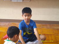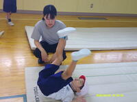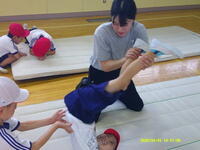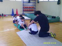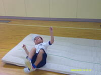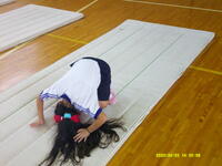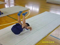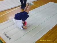 おへそを見て頭を内側に入れて丸くなること(頭頂部をつかないこと)、と転がる感覚を身につけることが基本ですが、後転ではこの後の後転に関する技に共通の大切な大切な約束、耳の横に置いた手を動かさずにマットにつくこと(+回転時に両手でマットを押せたら満点)がしっかりと身に付くよう、補助をしながら練習していました。身体をしっかり丸める感覚が備わっていれば、手を突かなくても後転をすることは可能ですが、開脚後転、伸膝後転、後転倒立等の今後の学習で必ずつまずきます。「うさぎさんの耳の手、そのままだよ~」と声をかけながら、練習を重ねていました。マット遊びの段階だからこそ、基礎基本を大切に頑張ってほしいです。
