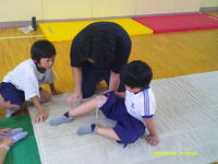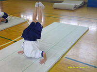 現在は、各学年が体育でマット運動に取り組んでいます。1・2年生は、「マット遊び」で、前転・後転の学習(こちらがメイン)を行っていました。