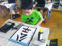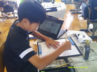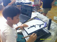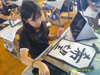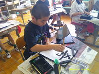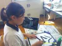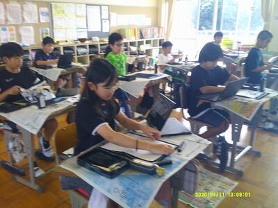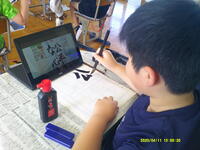 「希望」「人権」「公平」「平和」「未来」「明るい心」・・・それぞれが選んだテーマで、画面上のお手本を見ながら真剣に取り組んでいました。「お手本がPC画像!?」と思われる方もいるかも知れませんが、自分は「こういう取り組み方もいいなぁ。」という思いで子どもたちの様子を見ていました。
