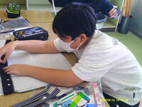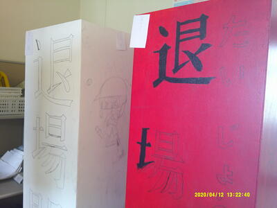 6年生が総合的な学習の時間を使って(探究的な学習活動であるかは微妙ですが)、卒業制作の作製に取り組んでいました。今年の卒業制作は、運動会の入退場門です。木製のパネルを使って組み立てた入・退場門に、インターネットで出力した文字を参考にレタリング(手書き)で入れ、イラストを描いて完成させます。
