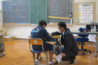 本日、1年生の校内研究授業を行いました。本校では、算数の研究をしています。生活に密着した導入を行うこと。子どもたち一人一人の特性に合った指導をすること、ICTを活用した学び合いをすることの3点を特に力を入れて研究しています。今日は、1年生の「大きな数」の展開でした。子どもたちは、クロムブックを使って、自分で考えたおはじきの数え方を写真で取り込み、考え方を直接書き入れて、二人組、三人組で共有しました。その後、大画面でクラスで共有し、発表し合いました。