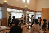 本日、6年生が、野田市農政課の講師の先生1名、地域の講師の先生3名をお招きして、郷土料理の「太巻き祭り寿司」づくりに親子で挑戦しました。卒業を間近に控えた6年生が、小学校での思い出づくりも兼ねた「太巻き祭り寿司」づくりです。「切ってみるまでどんな模様になっているかドキドキする」、そんなスリル満点な太巻き作りでした。講師の先生が実演してくださったときは、出てきたすてきな模様に歓声が上がりました。子どもたちにとっては、初めての経験で、難しい作業でしたが、講師の先生方の丁寧なご指導のおかげで、バラとカタツムリの模様の太巻きが完成しました。どのグループも味のある世界で一つだけの「太巻き祭り寿司」が完成しました。ある児童は、親と子の共同作業がとても楽しかったと言っていました。