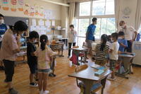 本日、3年生が2年生の教室に行き、国語の「のらねこ」の学習で作成したリーフレットと図工の学習で作った「ビー玉コロコロ」を紹介しました。グループに分かれ、時間で移動しながら交流しました。本校は、在籍人数が少ないので、このような異学年交流をたくさん行い、小規模学校におけるリスクを補っています。また、このように学習の成果を交流授業で他学年に伝える活動を通して、表現力を養っています。3年生は、口々に「3年生になったらこんな学習をするんだよ。」と2年生に声をかけ教えていました。2年生にとっても、一つ学年が上がった時の学習内容を知ることができ、よい経験となりました。また、3年生が作った図工の作品で遊ばせてもらってとても嬉しそうでした。