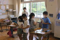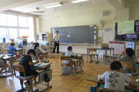 本校では、1年生から英語活動の授業を行っています。この写真は、昨日の1年生の学習の様子です。ゲームをしながら楽しく英語に親しむ授業です。ALTのメルスィー先生が、果物と野菜の名称を英語で言いながら、絵が描いてあるカードを黒板に貼っていきます。指名された人が前に出ていってカードを1枚選びます。そのカードは、好きなものか嫌いなものかを当てるゲームです。好きなものだと思った人は立ちます。嫌いなものだと思った人は座ったままです。Yes or No です。答えがわかるたびに歓声が上がります。このようなゲームを通して英語に親しんでいます。
