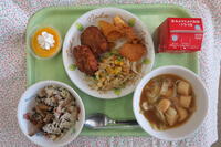 今日は、おはなし給食17日目でした。今日の主役は、「ふしぎ駄菓子屋 銭天堂 第16巻」に登場するいいものナゲットです。千葉県産の豆腐とひじきと鶏肉を使ってナゲットを作りました。「ふしぎ駄菓子屋 銭天堂」は、子どもたちに大人気のシリーズ本です。現在18巻まで発売されています。どこともわからない町の路地にある銭天堂のおかみは、紅子という大柄の女の人です。この18巻には、4つの話が収録されています。その中に「いいものナゲット」というお話があります。主人公は幼稚園児の信太です。このナゲットを食べるといいものが手に入る駄菓子です。信太はこのナゲットを食べてどうなるのでしょうか。そこに書いてある注意書きは?おはなし給食最終日の今日、お昼の放送で本を紹介したのは校長です。この本は、中学年~高学年向きの本です。また、このおはなし給食を企画したのは、栄養士の先生と学校図書支援員さんです。そして、給食を実際に作ってくれたのはお二人の調理員さんたちです。1ケ月続いたおはなし給食は、子どもたちにとってどうだったでしょうか。ご家庭で感想を聞いてみてほしいと思います。