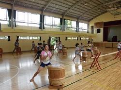 こちらは太鼓部。ミニバスケットやサッカーの練習を終えた子どもたちが、引き続き体育館で練習します。体は疲れていても、樽太鼓を打つときは、ちょっと気分が違います。どの子もひきしまった表情で真剣に取り組んでいます。