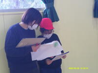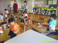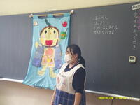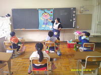 保健センターから、歯科衛生士の先生を講師にお迎えして1年生の「歯みがき教室」を行いました。最初に、食べ物の消化について、黒板に貼った布製の掲示物を使って、丁寧にお話がありました。そのあとは、葉の模型を使って乳歯と永久歯、歯の働きとうについて説明を受けました。「8020運動…80歳で20本の自分の歯を残す」についてと、歯肉炎・歯周病のお話の後、動画を視聴して「染め出し法」を用いた歯みがき指導を受けました。