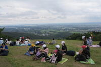 5年生の林間学校1日目の様子です。台風が心配されましたが、曇り空で暑さもやわらぎ、よい環境でハイキングができました。小町の里で、二ツ塚小、福田一小、福田二小合同の混合グループを作り出発しました。頂上の朝日峠は、見晴らしがよく気持ちの良い場所でした。景色を堪能しながらお弁当を食べました。茨城県青年の家での入所式とインドアビンゴは、福二小の担当でした。実行委員が練習の成果を発揮しました。