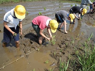 本校5年生も、去る5月8日(金)、「こうのとりの里」にある「共生ファーム」で田植えを