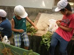 7月15日(水)、3年生は枝豆を収穫しました。品種名は”ゆあがり娘”というそうです。4月に種をまいて、発芽した苗を学校の裏の金剛寺さんの畑に植えさせていただきました。