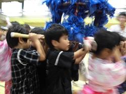 5歳児がくじらを乗せた御神輿を担いででてきました。さすが、年長さんですね。力強い演技です。一気に体育館がまつり会場になってしまいました。