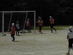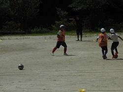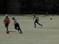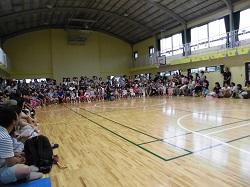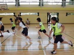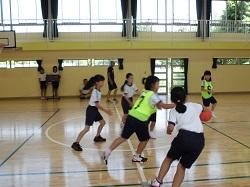 体育館の中では、ミニバスケット部がボールを追いかけています。屋内ですが、外と変わらないくらい蒸し暑いなかで練習に励んでいます。