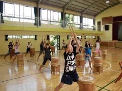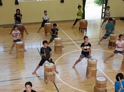 こちらは太鼓部。ミニバスケットやサッカーの練習を終えた子どもたちが、引き続き体育館で練習します。体は疲れていても、樽太鼓を打つときは、ちょっと気分が違います。どの子もひきしまった表情で真剣に取り組んでいます。