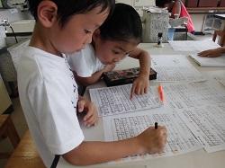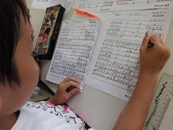 さっそく、太鼓の楽譜の読み方を上級生が教えています。こんなむずかしい楽譜を子どもたちは暗記するのです。 本校の伝統は、こうして上級生から下級生へと着々と受け継がれていくのです。 みんながんばれ!!