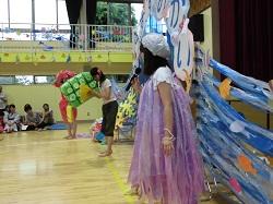 5歳児がくじらを乗せた御神輿を担いででてきました。さすが、年長さんですね。力強い演技です。一気に体育館がまつり会場になってしまいました。