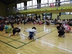フィナーレは、保育園の先生方による太鼓の演技。おなかにズンズン響いてくるすてきな演技でした。保育園の先生方は、太鼓の指導ができるように、特別に太鼓の勉強に行き、厳しい練習に耐えて、資格をとったそうです。いつか、福田二小の子どもたちの樽太鼓と共演できるといいですね。