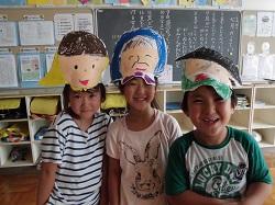 本日のオールキャストです。 お面も自分で作りました。 お休みの子もいたので、一人二役もやりました。 ご苦労さまでした。