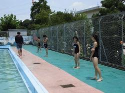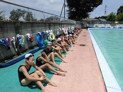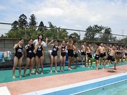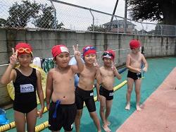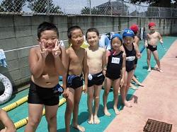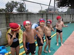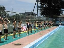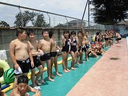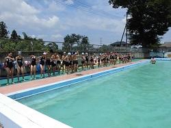 猛暑の中、部活動の練習などでがんばってきたご褒美に、最後はみんなで流れるプールを楽しんだり、上級生におんぶしてもらってプール内を歩き回ったりしながら楽しみました。 プールサイドは熱い(暑い)けれど、みんな気持ちよさそうです。