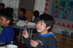 今日のメニューはいつもより豪華です。子どもたちの好きなものがたくさん出ました。6年生はいつも一緒に遊んだり活動したりしている”たてわりグループ”の席に拍手で迎えられました。
