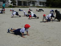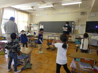今日は、1.2年生の合同体育初日です。体育係の2年生2人と1年生1人が、前に出て準備体操を行いました。1年生が2年生から教えてもらったのは、スタージャンプとバービーです。1年生は初めてでしたが、2年生がやって見せてくれたり優しく教えてくれたので、うまくできるようになりました。
