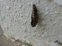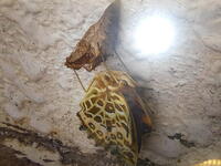 先日、3年生のお友だちが、児童昇降口の手洗い場のコンクリート部分に「光ったさなぎ」がいるのを見つけて教えに来てくれました。しばらく観察しているとだんだんと羽の模様が透けて見えるようになってきました。今朝見に行くと、少し黒くなっていたので、羽化が近いことが分かりました。気をつけながら何度か覗きに行きましたが、変化がないので、羽化は明日以降になるなと思っていたところ、4年生が羽化に気づき知らせてくれました。