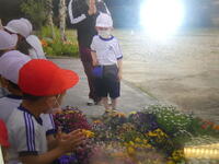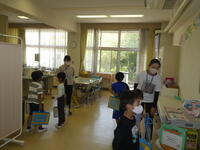 にじいろ学級のお友だちは、メルシー先生と一緒の学習です。「How are you?」「I am happy.」などのやり取りのあとは、1から5までの数を英語と指で表す活動です。みんなノリノリで参加していました。そのあとは、校庭に出て金魚(Gold fish)に餌をあげたり、バーベキュー(BBQ)のまねごとをしたりして英語に触れました。