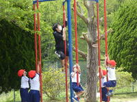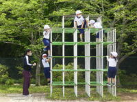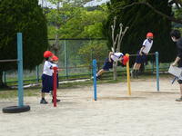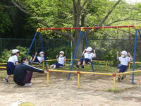 今日は、1年生にとっては、初めての校庭での体育でした。遊具を中心に2グループに分かれて運動しました。体育の時の約束を確認し、学習に慣れたら、2年生と合同の授業になります。