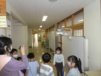 2年生が、昨年の生活科の学習で学んだことを生かし、各探検場所で1年生に説明していました。2年生は、けやきホールで使う大型プロジェクターについて、「離れている人と話をする学習などに使うものです。」と説明したり、校長室では、「校長室にある校長先生の写真は38枚あります。」などと教えてあげたりと頑張っていました。