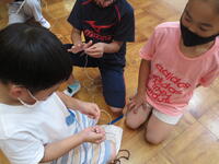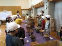 最後は、縄文の時代に思いを馳せながら「火起こし体験」をしました。雨が降ってきたので、ひさしのある昇降口前に急遽場所を変えて行いました。最初はうまくいかないグループもありましたが、慣れてくるとコツをつかみ、どのグループも火を起こすことができました。ポイントは「摩擦」と「酸素」です。木と木同士の摩擦の力で火種を作り、火種を木くずで包んで振ることで、酸素を送り発火させます。成功するたびに、みんなの顔がほころびました。