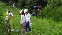 今日、1年生、2年生、にじいろ学級のお友だちが、ざりがにつりに行きました。ターザン山を通り、コウノトリの里近くの釣り場に行きました。最初は、なかなかコツがつかめず釣れずにいましたが、じっと静かに待っていると餌のスルメイカに食いついてきました。うまく釣り上げられると嬉しくて、本人も周りの友だちも歓声をあげました。本校の近くにある江川地区は、自然の宝庫です。釣りを楽しんでいる間、ウグイスをはじめたくさんの野鳥のさえずりが聞こえてきました。貴重な体験ができました。