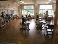 ここは1年生の教室です。自席での給食後の歯磨き(感染症防止策を講じて実施)が終わり、外に遊びに行く前の時間です。実は、関所を通らないと外に遊びに行くことができません。一人平均10秒の関所です。先生が見せる数字を見て、10の補数を言ってから遊びに行きます。例えば、6のカードだったら4と答えます。7だったら3、2だったら8と答えます。給食後の片付けにかかる時間は個人差があるので、待つこともありません。もう、1カ月続けているので、みんなよくできるようになりました。