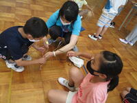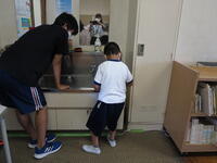 本日、にじいろ学級では、Soap bubble(シャボン玉)を作って遊びました。ALTのメルシー先生と一緒に活動しました。大きなシャボン玉ができると、メルシー先生は「Big soap bubbles!」と声をかけてくれます。メルシー先生は、全て英語で声かけしてくれるので、子どもたちは、楽しく活動しながら耳を鍛えていきます。コロナ渦ですので、吹いて作るシャボン玉づくりはできませんでしたが、ハンガーを使って作った用具や段ボールを使って、思い思いにシャボン玉づくりを楽しみました。