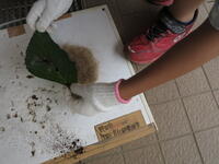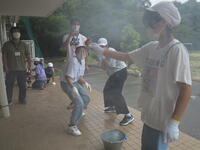 最後は、縄文の時代に思いを馳せながら「火起こし体験」をしました。雨が降ってきたので、ひさしのある昇降口前に急遽場所を変えて行いました。最初はうまくいかないグループもありましたが、慣れてくるとコツをつかみ、どのグループも火を起こすことができました。ポイントは「摩擦」と「酸素」です。木と木同士の摩擦の力で火種を作り、火種を木くずで包んで振ることで、酸素を送り発火させます。成功するたびに、みんなの顔がほころびました。