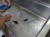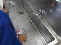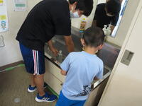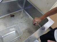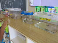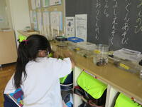 今日、教室を回っていると1年生の教室では、昨日釣ってきたザリガニの観察とお世話をしていました。観察をしてていると、一人ずつ担任の先生に呼ばれるので、自分の飼育ケースを持って流し場に行きます。昨日、堀で入れてきた水をきれいな水と交換するためです。水を捨てながらザリガニを出し、ケースを洗います。取り換え用の水を入れ、出したザリガニをケースに返します。初めての経験という子どもたちがほとんどでしたが、自分のザリガニですから、みんな頑張って挑戦していました。はさみが怖くてなかなか掴めない時には、先生に手助けしてもらって尾っぽを押してケースに戻すことに挑戦している子もいました。1年生は、週末家に持ち帰る子もいるそうです。ザリガニには毛が生えていることや、触るとすばやく動くことなどに気づいたり、オスとメスの見分け方がわかった子もいるようです。ご家庭で、家族団らんの話題にしてください。