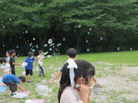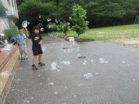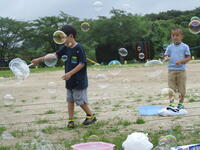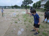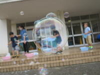 本日、4時間目に1年生がシャボン玉を飛ばしました。うちわや段ボールなど様々なアイテムを使って、試行錯誤していました。大きな大きなシャボン玉から、小さな小さな無数のシャボン玉など、使うものによってシャボン玉の大きさや形が違いました。今日の1年生の学習のめあては、「夏の季節を感じて楽しく遊ぶ」ことです。みんな、たくさんのシャボン玉ができると嬉しそうに楽しそうに遊んでいました。