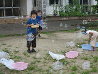 今日は、雨が降ったりやんだりしている陽気でした。湿度がとても高い日です。子どもたちのシャボン玉は、皆一様に低空飛行でした、また、一振りでとてもたくさんできました。遠くにも飛んでいきました。なかなか割れずいろいろなところにくっついていました。虹色でした。晴れの日のシャボン玉の跳び方や様子とは違っていました。少し学年が上がるとどうしてだろうと疑問を持つ子がいます。さあ、どうしてなのでしょう?晴れの日は、高く高く屋根の上まで飛んでいってすぐに壊れて消えてしまうのに・・・。そんな不思議について親子で会話するのも楽しいですね。